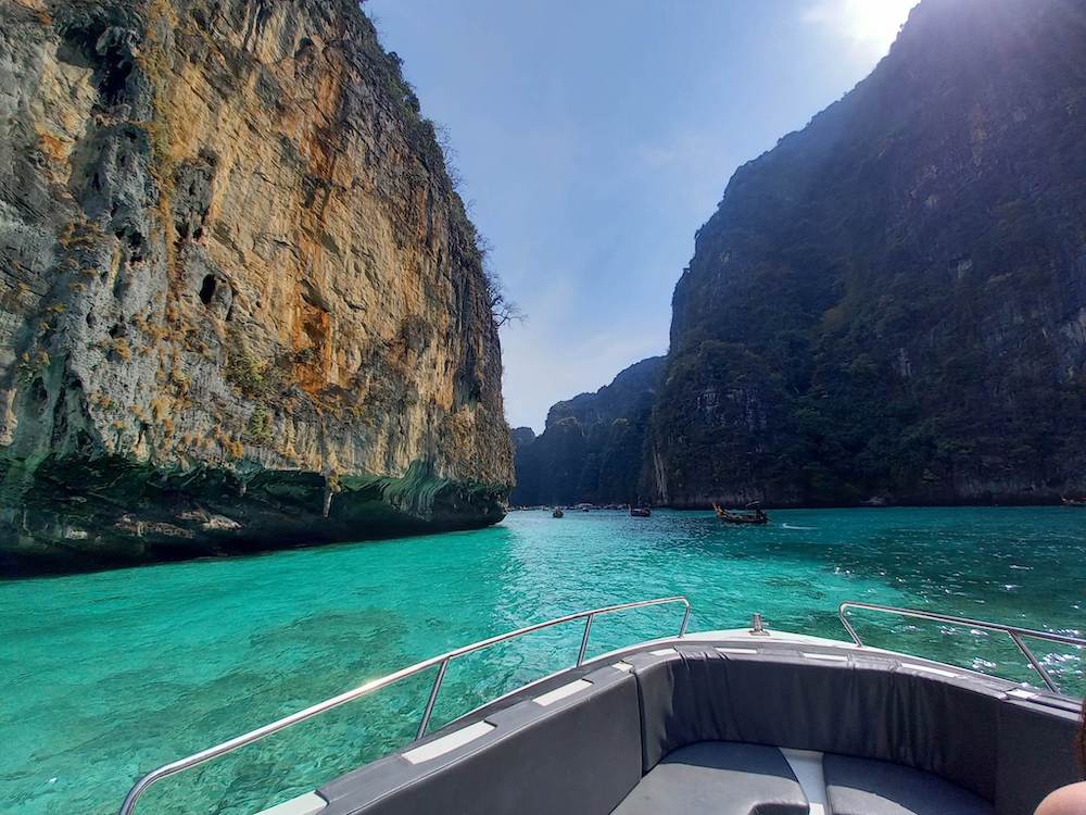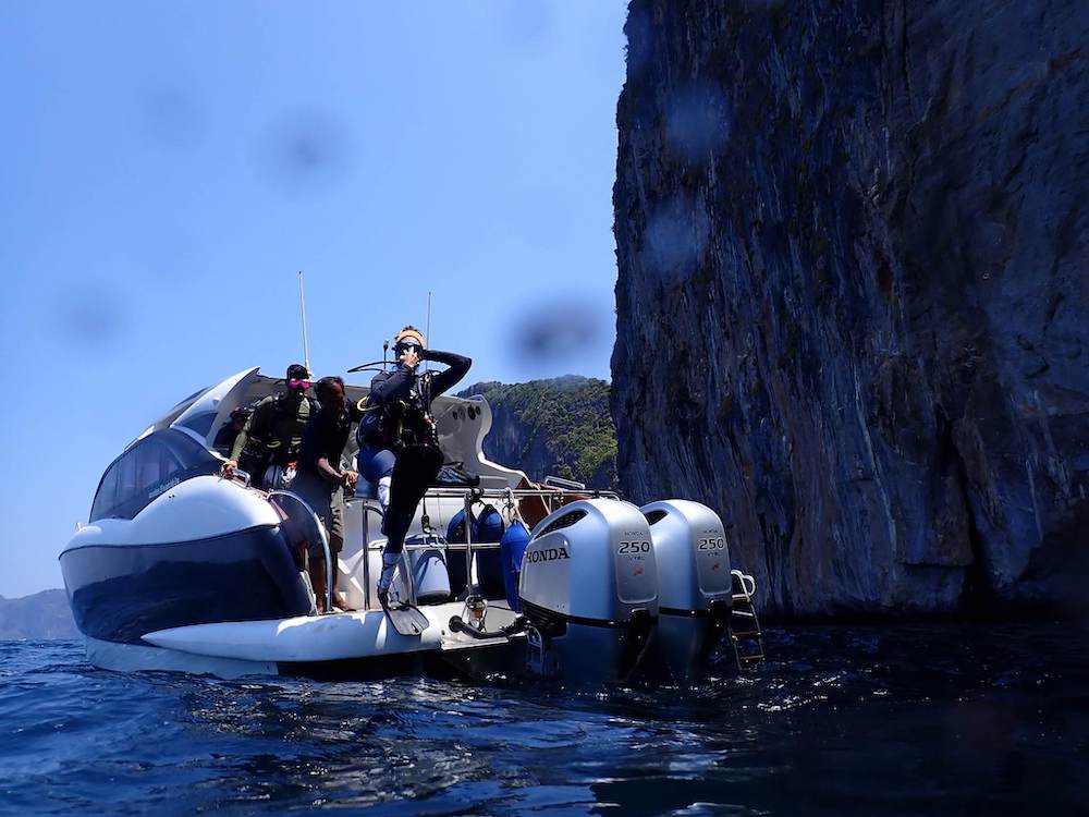Phi Phi Islands are located approximately 1 hour 15 minutes east of Chalong Pier by speedboat. The Phi Phi archipelago consists of several islands including Phi Phi Don, which has a town, and Phi Phi Leh, famous for Maya Bay. Main dive points are around Phi Phi Leh and nearby islands such as Bida Nok and Bida Nai.